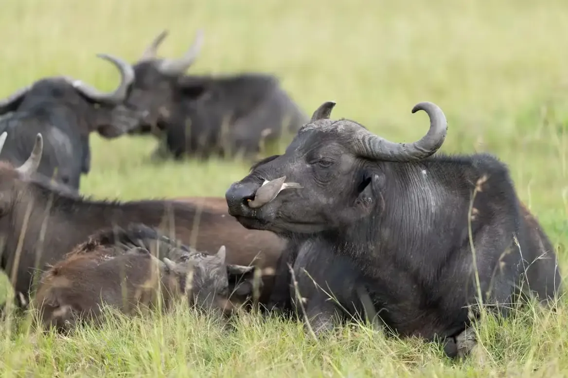 The African Buffalo The African Buffalo is one of the sub-Saharan African bovines. It is found across the African savanna and is mostly spotted grazing during the African safari tours, especially in some of the premier national parks in Kenya, from the famous Maasai Mara National Reserve to the little-known Meru National Park. The African buffalo, scientifically known as syncerus caffer, is closely related to the domesticated cow. The African buffalo is also related to other buffalo species like the Asian water buffalo, American bison, and domestic cattle. The African Buffalo has never been domesticated, unlike its other species, such as the wild yak and wild water buffalo. Its main predators are the lions, the spotted hyena, the Nile crocodile, and the African wild dog. The African Buffalo is most threatened by hunters hunting them for their skin and the shield-like horns. It is one of the big five animals in Africa, together with the African lion, the African Bush Elephant, the rhino, and the African leopard. The size of the African Buffalo The African Buffalo is the largest among the bovines. It is approximately 1.0 to 1.3 m (3.3 to 5.6 ft) from the shoulder. The tail is 70 cm to 110 cm (28 to 43 in) long. The cape buffalo can weigh between 425 and 870 kgs( 937 and 1,918 lb). On the other hand, the African Forest Buffalo is smaller in size, measuring between 250 and 450 kgs, which is (600 to 1000 lb). The front part of the African Buffalo is heavier than the back, and for that reason, the front hooves are wider than the rear. The male African Buffalo has white circles around the eyes, and its coat changes with age from black to dark brown. The females are reddish brown, their horns are curved upward and back, and they have hair around their ears; they are more hairy than the males. Their horns, especially in the male, come close at the base to form a shield known as the “Boss”. The horn can grow up to 164 cm or 64.5 inches. It takes 5 to 6 years for the horns to grow, but the Boss form when they are 8 to 9 years old. The female African buffalo is known as the cow and does not have a boss. Buffalo species There are five species of buffalo The Cape Buffalo( syncerus caffer caffer): this species is found in southern and Eastern Africa. The Forest Buffalo ( S.C. nanus): this is the smallest among the buffalo species and is found in western and central Africa. The Sudan Buffalo (S.c. brachyceros ): This species is found in the drier northern parts of central and East Africa. The mountain Buffalo (S.c. mathewsi). This species is found in the Vurunga Mountains in Central Africa. The Nile Buffalo (S.c. aequinoctialis): This species is identical to the Sudan buffalo, and it is found in the drier northern regions of East and Central Africa. The Social Behaviour of the African Buffalo The African Buffalo is a highly social animal living in herds of variable sizes. The herd is made up of several females, calves and surrounded by a group of high-ranking males and females. The African buffaloes have a unique behaviour, where the female stand up, shake their bodies and sleep facing the direction they should move after resting. After shuffling for some time, which is mostly around an hour or more, females shuffle and go back to rest. They travel in the direction they have decided; this is a communal behaviour, and it does not depend on age or hierarchy. The African Buffalo will come together when attacked by predators to make it hard for predators to pick one of them. The calves are always secured in the middle of the herd, and they always respond to the distress call of one of their member. A distress call from the mother not only attracts the attention of the mother but also gets the attention of the whole herd. Since the African Buffalo is safe when in the herd, the dominant males can tolerate competition for mating from the subordinate bulls within the herd. The males can sometimes engage in shows and displays of dominance, which can sometimes turn into actual fights. The male African Buffalo face each other lowing with horns down, they wait for the other bull to do the same, they lock and twist their horns from side to side, a behaviour done by males and calves, but the females rarely spar. African Buffalo bulls separate from the herd during the dry season to form bachelor groups, and they live in two groups: one made up of those aged four to seven years, and the other made up of those aged 12 years and above. The older males that are no longer able to compete for mates may choose to live in solitude, and they are referred to as the “Dagger boys, “ and they are the most dangerous to humans. African Buffalo sounds They produce low-pitched sounds of about two to four seconds, and at an interval of three seconds to signal other members that it is time to move. When signalling a move to the water hole, they produce a maa sound about 20 times in a minute, and when aggressive, they produce grunts that can turn into rumble growls. When looking for calves, they make croaking sounds and the calves produce similar calls when in distress. The dominant male African Buffalo makes calls to announce their arrival and to alert the herd of a potential threat from the predator. Reproduction of African Buffalo The African Buffalo have a varying sexual maturity between males and females. The females mature at around 5 years, while the males mature at 4 to 6 years. The African Buffalo mates and gives birth during the rainy season; the males watch the female on heat and have a gestation period which takes about 11.5 months. The bonding between the mother and the calf is longer than in other bovids, ending when another calf is born. The African Buffalo have an average lifespan of 11 years in the wild. Where to see African Buffalo The African Buffalo is widely spread in Kenya and is frequently spotted either resting under tree shades or grazing during Dancom tours. Maasai Mara National Park Lake Nakuru National